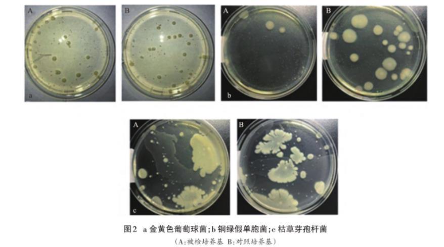分別移取金黃色葡萄球菌、銅綠假單胞菌、枯草芽孢桿菌菌液1 mL(含菌量50-100 cfu)至滅菌平皿中,分別傾倒胰酪大豆胨瓊脂培養(yǎng)基、胰酪大豆胨瓊脂對(duì)照培養(yǎng)基15 mL,待其凝固后,倒置于恒溫培養(yǎng)箱中30-35℃培養(yǎng)48 h。每個(gè)菌種每種類型培養(yǎng)基各做3個(gè)平行。測(cè)定菌落數(shù)。