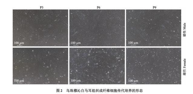 由于成纖維細胞與上皮細胞相比對酶消化液的敏感程度不同,用0.25%胰酶消化液處理,經(jīng)傳代純化培養(yǎng)后,得到較純的成纖維細胞。雄性和雌性烏珠穆沁白馬耳組織成纖維細胞經(jīng)過細胞傳代培養(yǎng)(圖2),均最多培養(yǎng)到80代(P80)。細胞呈現(xiàn)三角形,隨著細胞培養(yǎng)代次的增加,細胞生長匯合度達到80%以上需要的時間變長,且細胞形態(tài)由立體狀三角形形態(tài)逐漸變?yōu)楸馄讲灰?guī)則多邊形形態(tài)。兩種耳組織成纖維細胞經(jīng)傳代培養(yǎng)到后期,雄性耳組織成纖維細胞生長明顯優(yōu)于雌性耳組織成纖維細胞,且雌性耳組織成纖維細胞的形態(tài)略微扁平,整體呈現(xiàn)長梭形。