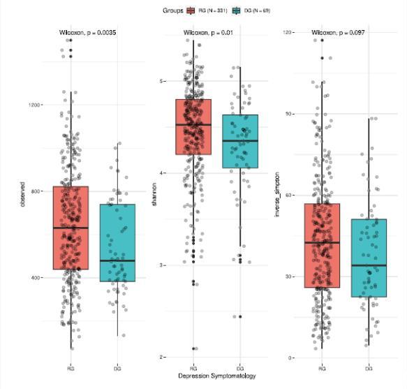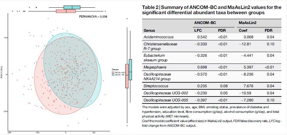 在方法上,研究采用橫斷面設(shè)計(jì),將參與者根據(jù)抗抑郁藥使用情況及BDI-II評(píng)分劃分為抑郁組(DG)與對(duì)照組(RG),通過(guò)16S rRNA測(cè)序獲取腸道菌群數(shù)據(jù),并使用液相色譜-串聯(lián)質(zhì)譜(LC-MS/MS)技術(shù)分析糞便代謝物譜。微生物分析包括α多樣性、β多樣性、差異豐度分析(MaAsLin2和ANCOM-BC)與功能通路預(yù)測(cè)(基于PICRUSt2);代謝物分析則通過(guò)彈性網(wǎng)回歸(Elastic-net)與ANCOVA控制協(xié)變量進(jìn)行篩選和驗(yàn)證,并進(jìn)一步計(jì)算微生物與代謝物之間的相關(guān)性。