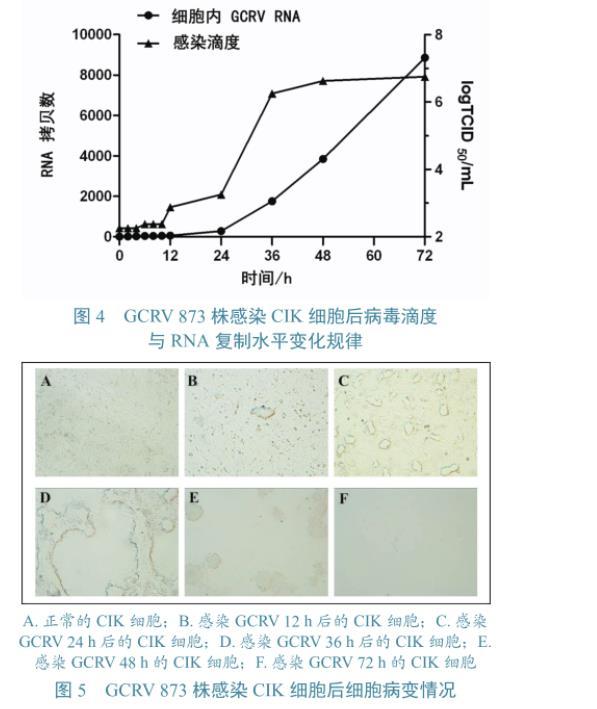 圖4 GCRV 873株感染CIK細(xì)胞后病毒滴度與RNA復(fù)制水平變化規(guī)律 圖5 GCRV 873株感染CIK細(xì)胞后細(xì)胞病變情況