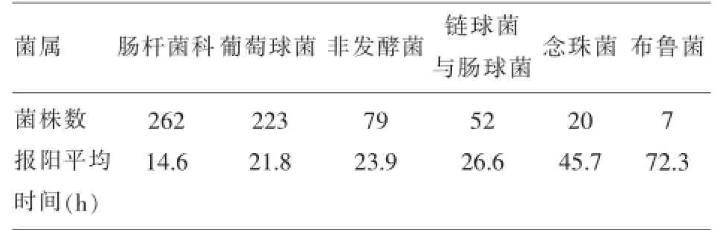 報陽時間656例報陽標(biāo)本中,腸桿菌科的細菌262例,占40%;葡萄球菌223株,占34%;非發(fā)酵菌79株,占12%;鏈球菌52株,占8%;念珠菌20株,占3%;布魯菌7株,占1%;假陽性13株,占2%。其報陽時間見表1。