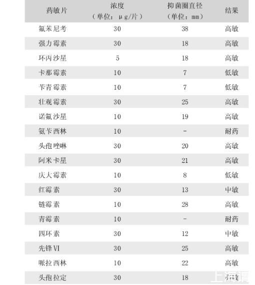 蘸取分離菌的肉湯培養(yǎng)物,接種于血瓊脂平板,將各種藥敏紙片分別平貼于培養(yǎng)基表面,37℃培養(yǎng)24h,測定抑菌環(huán)。
