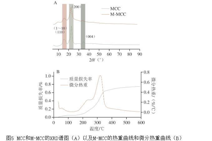 圖5 MCC和M-MCC的XRD譜圖(A)以及M-MCC的熱重曲線和微分熱重曲線(B)