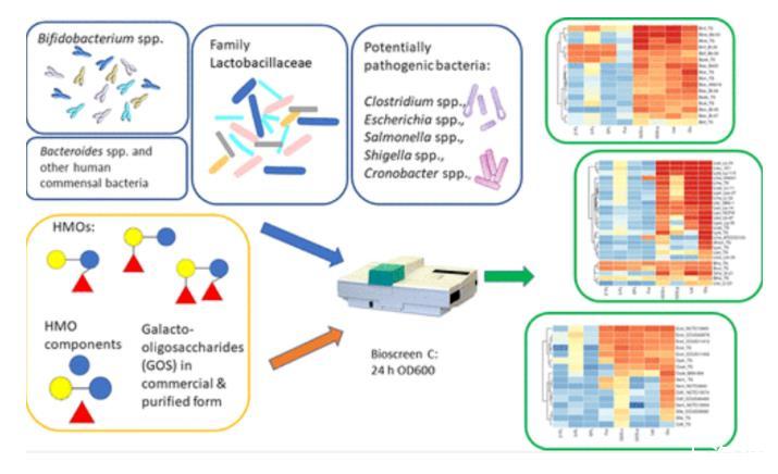 母乳是由嬰兒生長、發(fā)育和預(yù)防疾病所必需的必需營養(yǎng)素和生物活性分子組成。人乳寡糖(HMO)是人乳中發(fā)現(xiàn)的第三大固體成分,估計由大約200種不同的結(jié)構(gòu)組成。MO由葡萄糖、N-乙酰氨基葡萄糖、半乳糖(Gal)、巖藻糖(Fuc)和N-乙酰神經(jīng)氨酸(唾液酸)的組合形成,在還原端具有一個乳糖單元。HMO不會被嬰兒消化,但會被某些有益的腸道細(xì)菌選擇性地利用,例如長雙歧桿菌亞種、嬰兒雙歧桿菌(B.infantis)和雙歧雙歧桿菌。益生元是被宿主微生物選擇性利用的化合物,為宿主帶來健康益處。半乳糖寡糖(GOS)是半乳糖寡糖的混合物,葡萄糖在還原端。由于報告的健康益處,通常在嬰兒配方奶粉中補(bǔ)充GOS(6)并且直到最近才比HMO在商業(yè)上更容易獲得。評估了三種HMO——2‘-FL、3-巖藻糖基乳糖(3-FL)和二巖藻糖基乳糖(DFL)——對益生菌和病原菌生長的影響。除了常見的嬰兒病原體,如艱難梭菌、產(chǎn)氣莢膜梭菌、坂崎克羅諾桿菌、沙門氏菌屬和大腸桿菌外,還評估了多種益生菌,包括雙歧桿菌和乳酸桿菌,包括24種市售菌株。一些體外研究表明HMOs的利用存在菌株依賴性變化,研究人員選擇了一些類型菌株以及益生菌和潛在致病菌株將HMO的效果與商業(yè)GOS和純化的富含寡糖的GOS級分的效果進(jìn)行了比較。還評估了作為陽性對照的葡萄糖以及作為所研究HMO成分的乳糖和巖藻糖的影響。