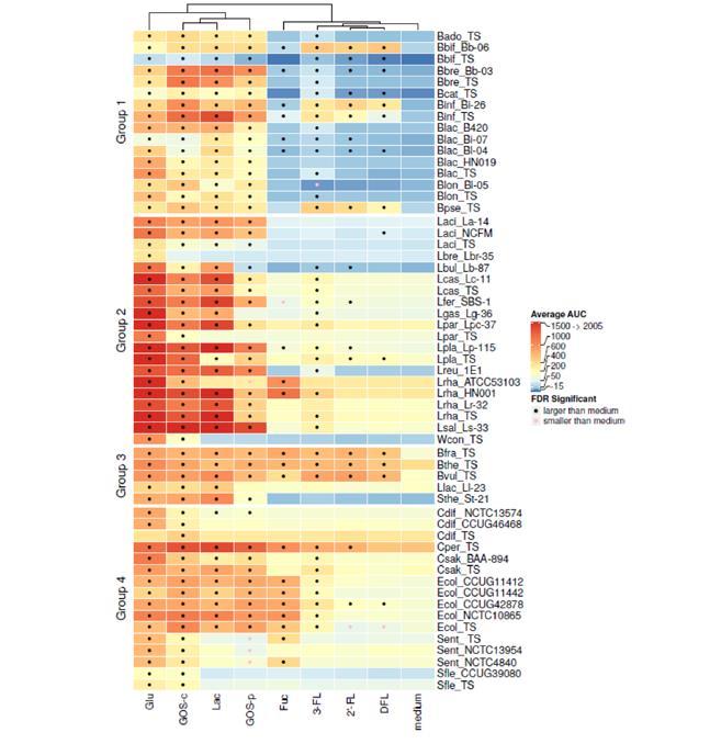 圖2、使用各種碳源和未添加碳源的培養(yǎng)基的細(xì)菌生長。細(xì)菌生長測量為在1%葡萄糖(Glu)、商業(yè)低聚半乳糖(GOS-c)、乳糖(Lac)、富含寡糖的純化GOS(GOS-p)存在下的生長曲線下面積(AUC)、巖藻糖(Fuc)、3-巖藻糖基乳糖(3-FL)、2'-巖藻糖基乳糖(2'-FL)或二巖藻糖基乳糖(DFL)。細(xì)菌菌株分為(1)雙歧桿菌,(2)乳桿菌科,(3)其他人類共生細(xì)菌,或(4)潛在致病菌。細(xì)菌菌株按縮寫在組內(nèi)按字母順序列出。AUC值用顏色編碼(深紅色)AUC>1500;AUC 1000–1500;AUC 600-999;AUC 400-599;AUC 200–399;AUC 50–199;AUC 15-49(深藍(lán)色),允許在介質(zhì)和碳源之間進(jìn)行比較。與相應(yīng)培養(yǎng)基比較的FDR校正顯著t檢驗(yàn)結(jié)果在相應(yīng)AUC單元格內(nèi)用點(diǎn)表示。