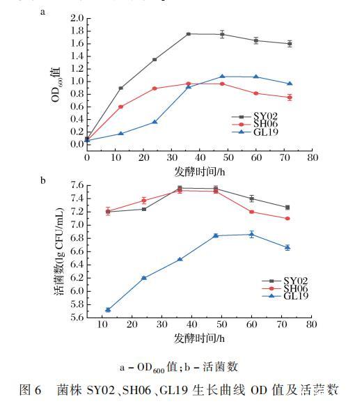 實驗篩選3株耐受性較強的菌株SY02、SH06和GL19,測定其生物量和生長曲線,結(jié)果如圖6所示,菌株SY02和SH06的活菌數(shù)及OD???值最大分別為1.755、0.967,36~48h處于穩(wěn)定期,48h后活菌數(shù)開始呈現(xiàn)下降趨勢,逐漸進入衰亡期。菌株GL19的活菌數(shù)和OD值均在24~48h生長繁殖速度快,處于對數(shù)期,菌體最大濃度分別為6.87 lg CFU/mL,48~60h處于穩(wěn)定期,60h后活菌數(shù)逐漸進入衰亡期。醋酸菌SY02、SH06、GL19都能在較短時間內(nèi)進入對數(shù)期,在這個階段,菌體以幾何級數(shù)增長,對外界環(huán)境具有強大的抵抗力。