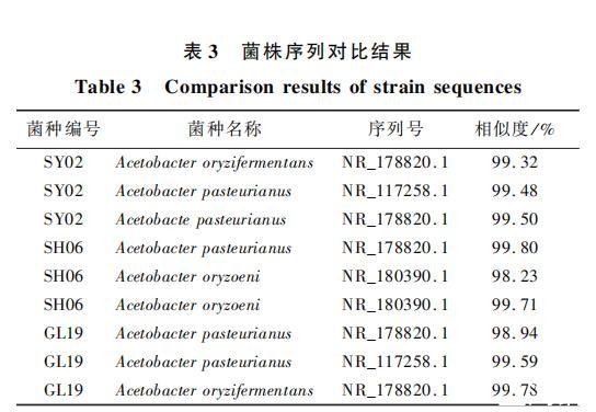 將菌株SY02、SH06及GL19的16S rDNA序列上傳到NCBI數(shù)據(jù)庫進行對比,結(jié)果見表3,對比發(fā)現(xiàn)3株菌株與序列號為NR_178820.1的A.pasteurianus同源性最高,相似度分別為99.50%、99.8%及99.78%。因而可確定篩選出來的3株菌均屬于巴氏醋桿菌(Acetobacter pasteurianus)。