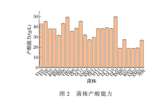 產(chǎn)酸量是反映醋酸菌的重要指標(biāo),篩選產(chǎn)酸能力較強的醋酸菌對提高醋醅酸度,改善傳統(tǒng)食醋工藝具有重要作用。
