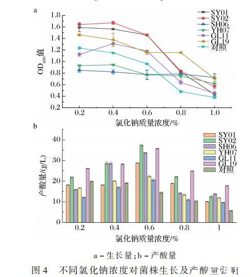 通過前期產(chǎn)酸定量實驗,共篩選出6株優(yōu)良菌株,分析其氯化鈉耐受性。結(jié)果如圖4所示,氯化鈉質(zhì)量濃度從2g/L增至6g/L時,菌株生長及產(chǎn)酸量基本不受影響;從4g/L增至8g/L時,對照菌生長量及產(chǎn)酸量呈現(xiàn)明顯下降趨勢;在質(zhì)量濃度為10g/L時幾乎停止產(chǎn)酸;從2g/L增至6g/L時,菌株SY01、SY02、SH06、YH07、GL11及GL19生長量及產(chǎn)酸量受到較小影響;從6g/L增至10g/L時,菌株SY02、SH06、GL19生長量仍分別0.571、0.724、0.706,產(chǎn)酸量分別為12.60、13.80、17.84 g/L,而菌株SY01、YH07、GL11生長量和產(chǎn)酸量呈現(xiàn)明顯下降趨勢,謝錦明等研究發(fā)現(xiàn),醋酸菌在氯化鈉濃度較低時仍可以生長,但隨著濃度增加生長會受到嚴(yán)重抑制,影響其產(chǎn)酸能力??偟膩砜?,氯化鈉對菌株SY01、YH07、GL11生長影響較大,因此在培養(yǎng)時,氯化鈉盡量控制在6g/L以內(nèi),保證菌株能較好產(chǎn)酸及生長。通過比較可知,在一系列氯化鈉濃度下,菌株SY02、SH06、GL19生長量和產(chǎn)酸量能力優(yōu)于其他菌,擁有較好的氯化鈉耐受性。