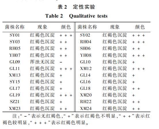 將前期分離篩選出的24株菌根據(jù)實驗方法1.3.4.1節(jié)進行產(chǎn)酸定性實驗,結(jié)果如表2所示,除菌株GL09外,其他菌株均能產(chǎn)生明顯的紅褐色沉淀,說明菌株GL09不具備產(chǎn)醋酸能力,因此鑒定該菌株不屬于醋酸桿菌屬。