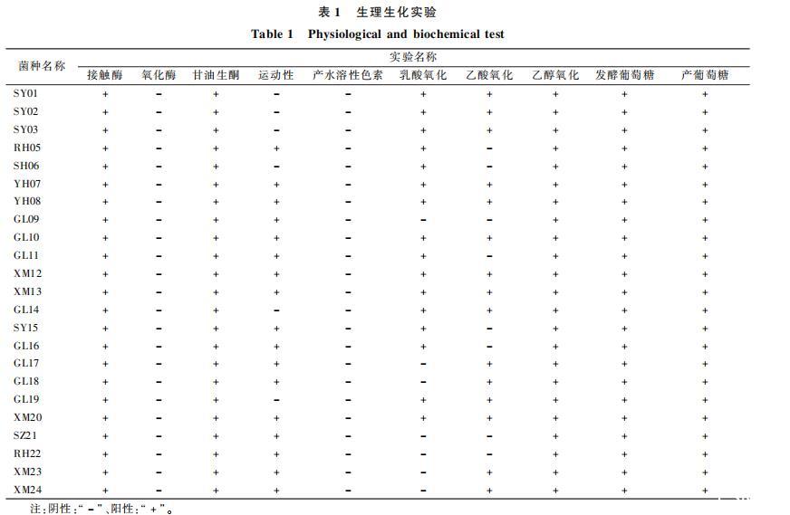 將前期分離篩選出的24株菌根據(jù)實驗方法1.3.3節(jié)進行生理生化實驗,結(jié)果如表1所示。24株菌在接觸酶、甘油生酮、乙醇氧化、發(fā)酵葡萄糖及產(chǎn)葡萄糖實驗中為陽性反應(yīng),在氧化酶、產(chǎn)水溶性色素中為陰性反應(yīng);在運動性實驗中,除菌株SY01、SY02、SY03、SH06、GL14、GL19為陰性反應(yīng)外,其余菌株均為陽性反應(yīng);乳酸氧化實驗中,除菌株GL09、GL17、GL18、SZ21、RH22、XM23、XM24菌為陰性反應(yīng)外,其余菌株為陽性;在乙酸氧化實驗中,除菌株RH05、SH06、GL09、GL11、SY15、GL16、SZ21、RH22外,其余菌株呈現(xiàn)陽性反應(yīng)。