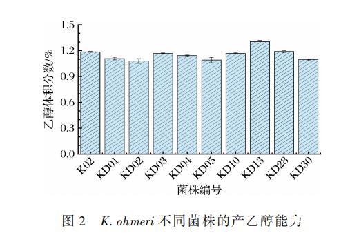 由圖2可知,10株不同的K.ohmeri乙醇產(chǎn)量均大于1%(體積分?jǐn)?shù)),KD13、KD28和K02產(chǎn)量較高,分別為1.30%、1.19%和1.19%。