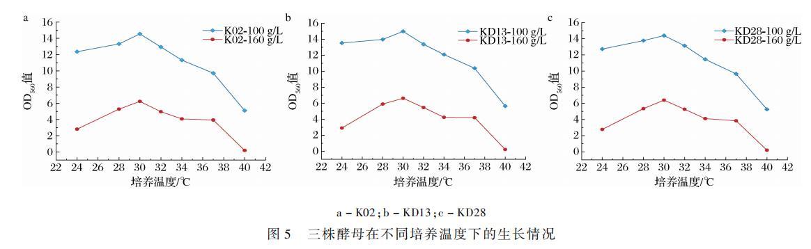 溫度是微生物生長的重要影響因素之一,最適生長溫度有利于獲得更多的發(fā)酵菌株。對3株酵母在24~40℃的生長情況進(jìn)行測定,結(jié)果如圖5所示。3株菌在2種鹽濃度下發(fā)酵液的OD???值隨溫度的升高呈現(xiàn)先升后降的趨勢,30℃時OD值最大,因此30℃是3株菌的最適生長溫度。溫度升至40℃時,160 g/L鹽質(zhì)量濃度的條件下,3株菌發(fā)酵液OD???值接近0,表明酵母在該條件下幾乎不生長。
