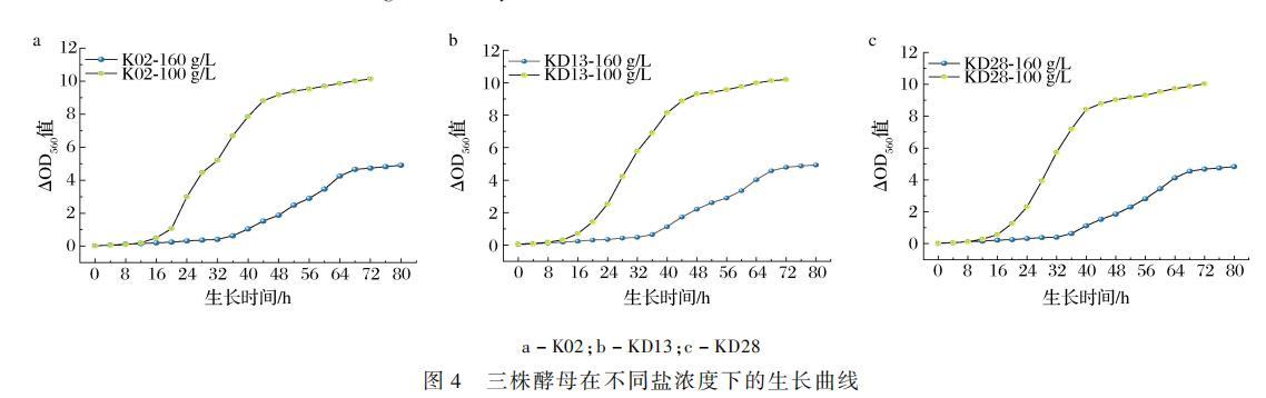 高鹽稀態(tài)醬油發(fā)酵鹽質(zhì)量濃度一般≥160 g/L,而減鹽發(fā)酵醬油的鹽質(zhì)量濃度則為100~120 g/L,為考察菌株在不同醬油生產(chǎn)中的生長特性,采取100 g/L和160 g/L鹽質(zhì)量濃度的豆芽汁培養(yǎng)3株K.ohmeri,結(jié)果如圖4所示。3株菌在相同鹽濃度下的生長曲線類似,100 g/L鹽質(zhì)量濃度下,3株菌對數(shù)期為16~44 h,44 h以后進(jìn)入穩(wěn)定期;而160 g/L鹽質(zhì)量濃度下,3株菌的對數(shù)期則延至36~64 h,64 h以后到達(dá)穩(wěn)定期。160 g/L鹽質(zhì)量濃度下,3株酵母穩(wěn)定期的ΔOD???的平均值為4.135,表明其在高鹽環(huán)境下生長情況良好。