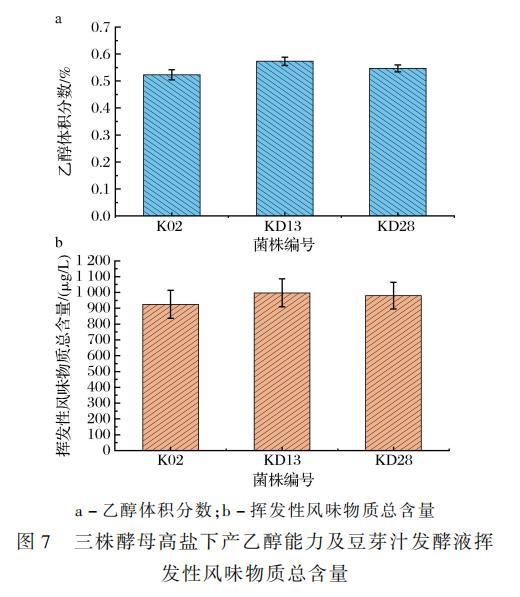 對3株酵母160 g/L鹽質(zhì)量濃度下的產(chǎn)乙醇能力進(jìn)行測定,結(jié)果如圖7-a所示。3株酵母豆芽汁發(fā)酵液中的乙醇體積分?jǐn)?shù)均高于0.5%,其中KD13最高,達(dá)到0.573%。進(jìn)一步分析豆芽汁發(fā)酵液揮發(fā)性風(fēng)味物質(zhì),發(fā)現(xiàn)發(fā)酵液中存在多種香氣成分,其中KD13發(fā)酵液總揮發(fā)性風(fēng)味物質(zhì)含量最高,為(997.54±88.15)μg/L(圖7-b)。綜合以上K.ohmeri發(fā)酵性能特點,選用KD13進(jìn)行后續(xù)的添加發(fā)酵應(yīng)用。