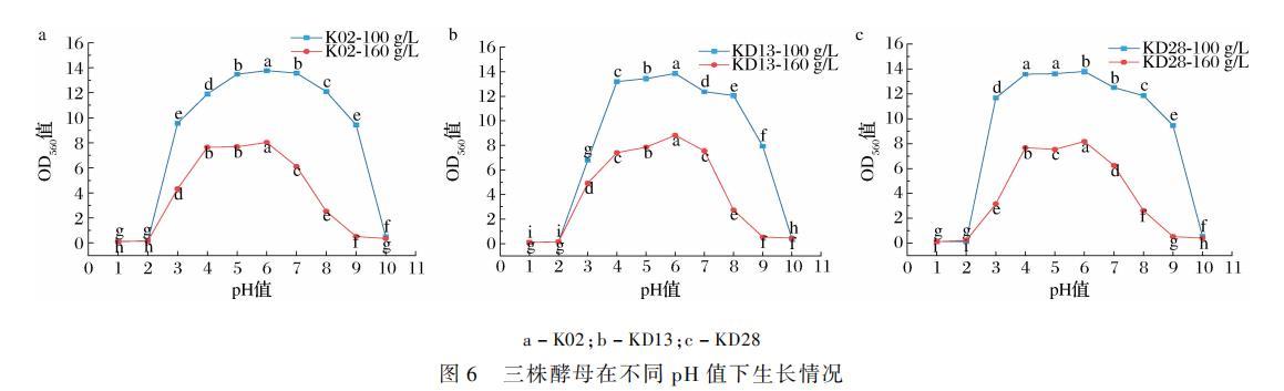 高鹽稀態(tài)醬油釀造過程中,醬醪醪pH值一般為4~6。采用初始pH值為1~10的培養(yǎng)基對3株酵母生長情況進(jìn)行測定,結(jié)果如圖6所示。100 g/L鹽質(zhì)量濃度下,pH值為3~9時,3株酵母都有一定的生長能力;pH值為4~6時,生長能力最好;而在pH值為1~2及10的條件下不可生長。160 g/L鹽質(zhì)量濃度下,3株酵母在相同pH值條件下的OD???值均低于100 g/L鹽質(zhì)量濃度,pH值為3~8時都有一定生長,其中pH值為4~6時,生長能力最好,pH值為1~2及9~10的條件下不可生長。