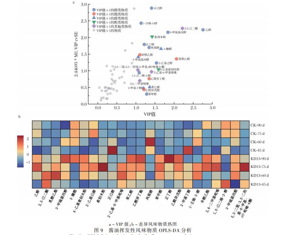 以表2中60種香氣成分作為因變量,不同發(fā)酵時間的2組醬油作為自變量進(jìn)行OPLS-DA分析,并計算預(yù)測變量重要性投影(variable importance in projection,VIP)。VIP值越大,因變量對樣品區(qū)分度的貢獻(xiàn)值就越大,若VIP值>1表明為關(guān)鍵因變量。如圖9-a所示,共篩選到23種VIP值>1的差異風(fēng)味物質(zhì)。其中酯類4種、醇類物質(zhì)10種、酚類物質(zhì)2種、醛類物質(zhì)3種、其他類4種。對上述23種物質(zhì)進(jìn)行熱圖分析,由圖9-b可以看出,KD13組多種香氣物質(zhì)含量比CK組多,其中包括酯類物質(zhì)中的乳酸乙酯(奶油香)、辛酸乙酯(酒香)、乙酸異戊酯(花香)、乙酸異丁酯(花香);醇類物質(zhì)中的乙醇(醇香)、正丁醇(葡萄酒香)、苯甲醇(花香);醛類物質(zhì)中的苯乙醛(果香)、3-甲硫基丙醛(醬香);酚類物質(zhì)中的4-乙基愈創(chuàng)木酚(煙熏香);雜環(huán)類物質(zhì)中的2-乙基-6-甲基吡嗪(可可香)、2,6-二甲基吡嗪(堅果香)、2,3-二氫-3,5-二羥基-6-甲基-4H-吡喃-4-酮(焦糖香)。以上分析表明,KD13不僅對醬油中乙醇含量有提升作用,同時對乙酯類等多種醬油特征風(fēng)味物質(zhì)有增益作用。