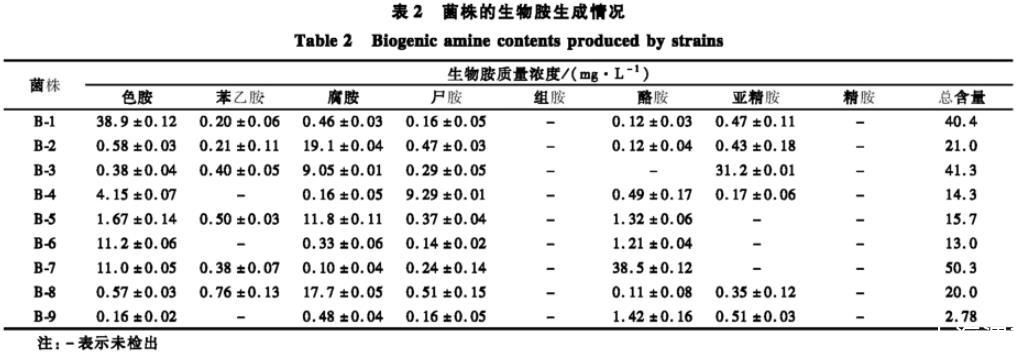 為進(jìn)一步確認(rèn)這9株菌的產(chǎn)胺能力,將9株菌株分別接種到TSB培養(yǎng)基中,30℃培養(yǎng)3 d,分析培養(yǎng)液中生物胺產(chǎn)生質(zhì)量濃度,結(jié)果如表2所示。由表2可知,9株菌均可產(chǎn)生色胺、腐胺和尸胺,菌株B-9生物胺生成能力較其他菌株最弱,總質(zhì)量濃度為2.78 mg/L。B-1、B-3和B-7的產(chǎn)胺能力較強(qiáng),總生物胺質(zhì)量濃度分別為40.4、41.3和50.3 mg/L。其中B-1的色胺產(chǎn)生質(zhì)量濃度最高,為38.9 mg/L;B-3亞精胺產(chǎn)生質(zhì)量濃度最高,為31.2 mg/L;B-7酪胺產(chǎn)生質(zhì)量濃度最高,為38.5 mg/L。