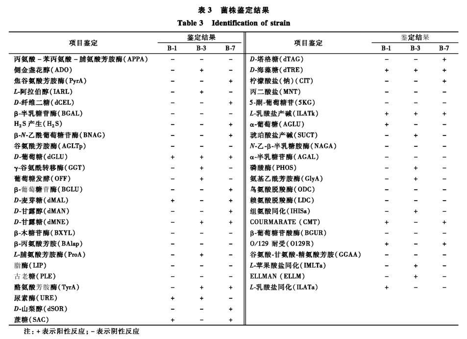 VITEK 2鑒菌儀是通過將檢測菌株的各項(xiàng)生理生化實(shí)驗(yàn)反應(yīng)結(jié)果與已知的菌株數(shù)據(jù)庫作比較,從而推測菌株的可能性概率,可信概率范圍為85.0%~99.0%。經(jīng)鑒定,3株菌株的生理生化實(shí)驗(yàn)結(jié)果如表3所示。鑒定B-1菌株為巨型球菌(Macrococcuscaseolyticus),可信概率為99.0%;B-3菌株為產(chǎn)堿普羅威登斯菌(Providenciaalcalifaciens),可信概率為97.0%;B-7菌株為糞腸球菌(Enterococcusfaecalis),可信概率為99.0%。