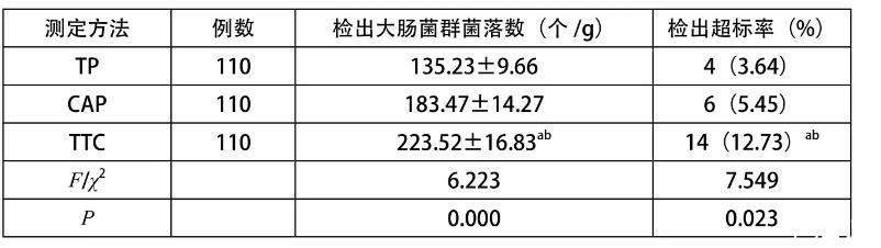 3種不同檢測方法的檢出大腸菌群菌落數(shù)和檢出超比率相比較,差異均具有統(tǒng)計學意義(P<0.05);其中TCC法在兩項指標中均最高,差異也具有統(tǒng)計學意義(P<0.05)。見表2。