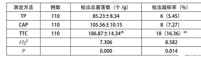 3組不同檢測方法檢出總菌落數(shù)相比較,差異具有統(tǒng)計學意義(P<0.05)。其中,TCC法檢出總菌落數(shù)顯著高于TP法和CAP法,差異也具有統(tǒng)計學意義(P<0.05)。3種不同檢測方法的檢出超標率相比較,差異具有統(tǒng)計學意義(P<0.05)。其中,TCC法的檢出超標率顯著高于TP法和CAP法,差異也具有統(tǒng)計學意義(P<0.05)。見表1。