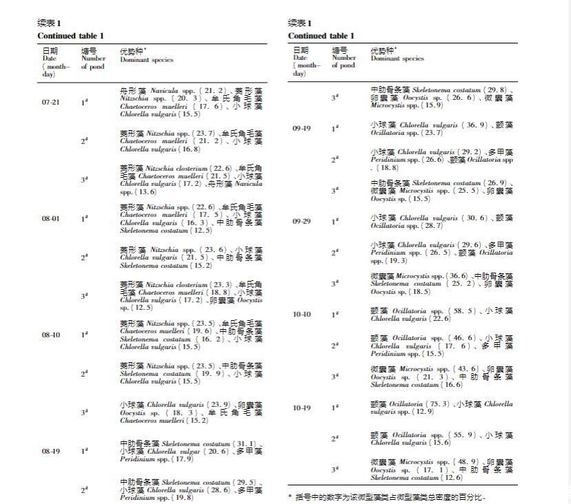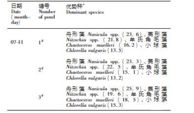 3口池塘的微藻種類組成,養(yǎng)殖前期種類較多,主要是硅藻和綠藻,優(yōu)勢種有硅藻門的菱形藻[Nitzschia spp.]、舟形藻[Navicula spp.]、中肋骨條藻[Skeletonema costatum]和綠藻門的小球藻[Chlorella sp.]、卵囊藻[Oocystis sp.]等;養(yǎng)殖中后期種類減少,優(yōu)勢種也發(fā)生了變化,主要是綠藻、藍藻和甲藻,3口池塘的微藻種類組成略有不同。1號池塘中后期的優(yōu)勢種有綠藻門的小球藻、藍藻門的顫藻[Ocillatoria spp.],2號池塘的優(yōu)勢種為綠藻門的小球藻、藍藻門的顫藻和甲藻門的多甲藻[Peridinium spp.],3號池塘的優(yōu)勢種為綠藻門的卵囊藻[Oocystis sp.]、硅藻門的中肋骨條藻和藍藻門的微囊藻[Microcystis spp.]。