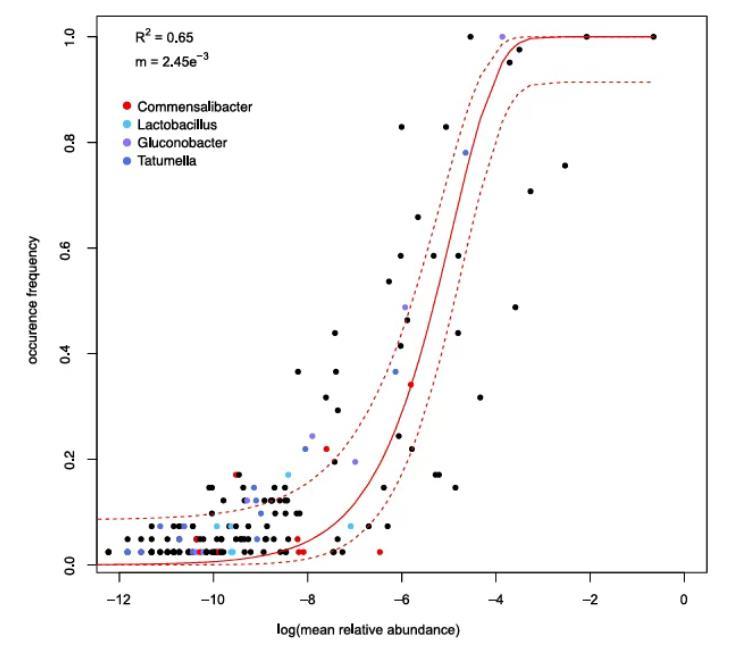 此外,Commensalibacter的不同ASV在中性模型中出現(xiàn)了三種模式:有些高于預(yù)期(說(shuō)明受到宿主選擇),有些與模型預(yù)測(cè)一致,還有少數(shù)低于預(yù)期(可能受到排斥)。這表明即使在同一屬中,不同菌株可能也具備不同的定殖策略。