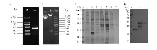 圖1 Microplusin-like基因擴增、雙酶切和重組蛋白的表達結果注:A.Microplusin-like基因擴增,M.DL2000 marker,1.Microplusin-like PCR產(chǎn)物;B.雙酶切結果,M.DL5000 marker,1.pCold-SUMO;2.pCold-SUMO/Microplusin-like;C.SDS-PAGE結果,M.14.4~116 kDa protein marker,1.pCold-SUMO空載未誘導,2.pCold-SUMO空載誘導,3.重組載體未誘導,4.重組載體誘導,5.重組載體表達沉淀,6.重組載體表達上清,7.純化后的重組蛋白;D.Western Blot結果,M.10~250 kDa蛋白marker,1.空載體誘導,2.重組載體誘導,3.純化后的重組蛋白。