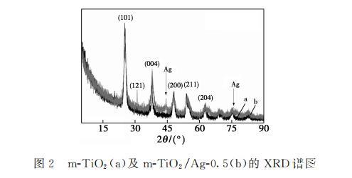 圖2為m-TiO2和m-TiO2/Ag-0.5的XRD譜圖。由圖可見,m-TiO2在2θ=4~90°掃描范圍內(nèi)有5個(gè)明顯的衍射峰,分別位于25.3°、37.9°、48.0°、53.9°和62.6°處,與銳鈦礦相m-TiO2對(duì)應(yīng)的(101)、(004)、(200)、(211)和(204)衍射面(PDF:21-1272)能夠很好地吻合,而在2θ=30.1°的衍射峰則對(duì)應(yīng)的是板鈦礦(121)晶面,由峰的相對(duì)強(qiáng)度可知,這是以銳鈦礦為主含有少量板鈦礦的混晶。