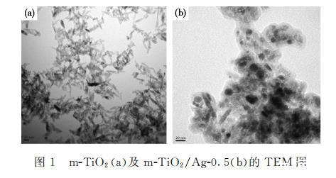 圖1為m-TiO2和m-TiO2/Ag-0.5的TEM圖。由圖可知,m-TiO2中有有序介孔的分布,其介孔結(jié)構(gòu)數(shù)量大,均勻性良好。這是因?yàn)榇紵岱ê铣梢杂袡C(jī)溶劑代替了水溶劑,可以降低m-TiO2顆粒表面羥基的存在,m-TiO2顆粒間的團(tuán)聚現(xiàn)象得到改善,分散性也隨之提高。另外,m-TiO2/Ag-0.5中Ag在m-TiO2表面形成了納米團(tuán)簇,銀負(fù)載的m-TiO2納米局部區(qū)域被填充,且粉末有輕微團(tuán)聚傾向。