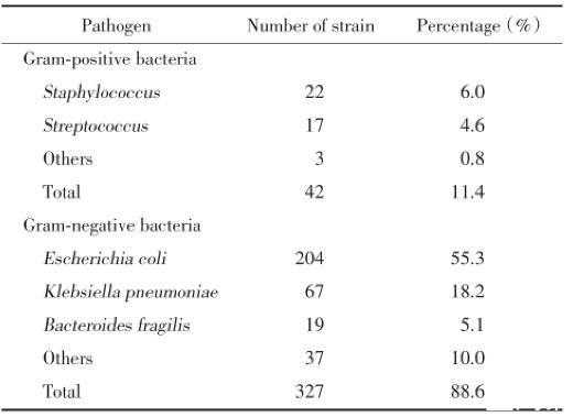 300例患者中277例細菌培養(yǎng)陽性,陽性率為92.3%,共培養(yǎng)分離出369株病原菌,179例患者膿液培養(yǎng)出了1種細菌,86例患者的膿液中同時培養(yǎng)出2種細菌,6例患者的膿液中同時培養(yǎng)出3種細菌。細菌鑒定結(jié)果如表1所示,不同菌種間分布具有顯著差異,其中革蘭陽性菌42株(占11.4%),革蘭陰性菌327株(占88.6%)。革蘭陰性菌中,大腸埃希菌204株(占55.3%),其次為肺炎克雷伯菌67株(占18.2%)。