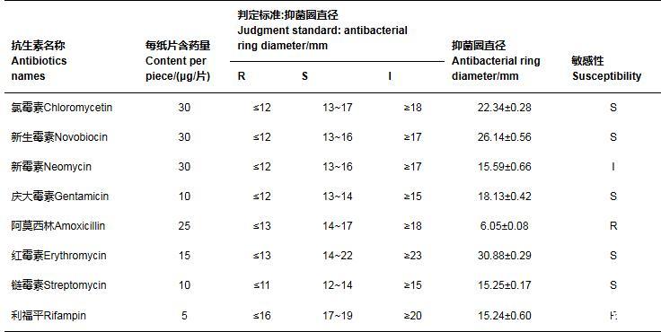 選擇8種抗菌藥物(氯霉素、新生霉素、阿莫西林、新霉素、慶大霉素、紅霉素、鏈霉素、利福平),以紙片法對(duì)待測(cè)菌株進(jìn)行藥物敏感性測(cè)定,以了解待測(cè)菌株對(duì)抗菌藥物的耐藥性。選取藥敏紙片,按照藥敏紙片擴(kuò)散法操作步驟進(jìn)行相關(guān)菌株的藥敏試驗(yàn)。