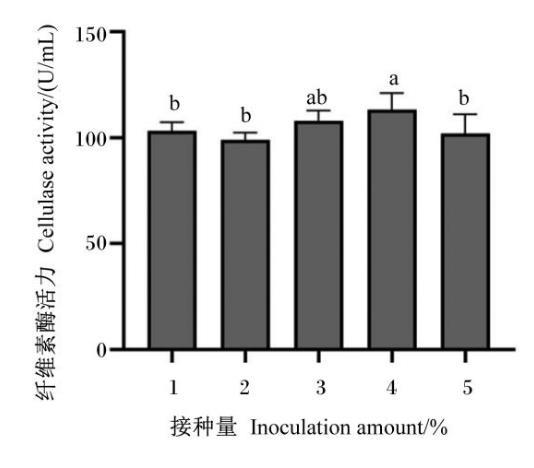 當(dāng)發(fā)酵培養(yǎng)基的初始pH為6,發(fā)酵時(shí)間為48 h時(shí),接種量對(duì)菌株GXUN13068-1產(chǎn)酶能力的影響如圖4所示。當(dāng)接種量為4%時(shí),菌株GXUN13068-1的產(chǎn)酶能力達(dá)到最大,所產(chǎn)纖維素酶活力為113.23 U/mL。