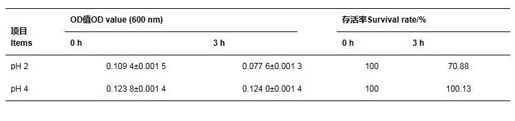 將待測(cè)菌株接種到NB培養(yǎng)基中,搖瓶發(fā)酵24 h,將待測(cè)菌株發(fā)酵液按接種量10%接種于10 mL pH分別為2.0、4.0的人工胃液中處理3 h,以0 h的樣品作為對(duì)照,計(jì)算菌株存活率。
