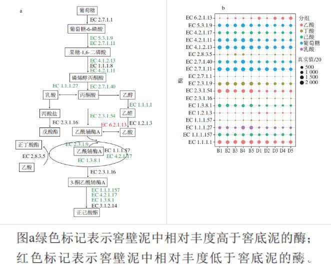 窖壁泥中參與酸代謝的酶類相對(duì)豐度顯著高于窖底泥,并且具有相對(duì)豐度顯著高于窖底泥的產(chǎn)酸細(xì)菌,比如Caproiciproducens、Lactobacillus、Syntrophaceticus等,推測(cè)窖壁泥富集的多種細(xì)菌群落,具有產(chǎn)生參與酸代謝酶類的特性,這些產(chǎn)酸細(xì)菌具有以乙醇或乳酸為底物合成丁酸己酸的潛力,能為白酒釀造代謝豐富的風(fēng)味物質(zhì),例如乙酸、丁酸、己酸等。Lactobacillus在發(fā)酵過(guò)程中將糖類分解成乳酸,具有較強(qiáng)的代謝碳水化合物的產(chǎn)酸能力,乳酸可作為合成其他脂肪酸的底物,同時(shí)可以與乙醇通過(guò)酯化反應(yīng)生成濃香型白酒獨(dú)特風(fēng)味的乳酸乙酯;Caproiciproducens是窖壁泥中的優(yōu)勢(shì)菌屬,該類菌具有利用果糖、乳酸、半乳糖和木糖等為底物代謝乙酸、丁酸和己酸等短鏈脂肪酸的功能,主要是通過(guò)短鏈脂肪酸逆β-氧化代謝途徑;窖壁泥中的Aminobacterium與銨態(tài)氮呈極強(qiáng)正相關(guān),Aminobacterium不僅可以降解氨基酸生成乙酸和丁酸等,也可以降解氨基酸增加銨態(tài)氮的含量,這可能是窖壁泥銨態(tài)氮的含量高于窖底的原因。
