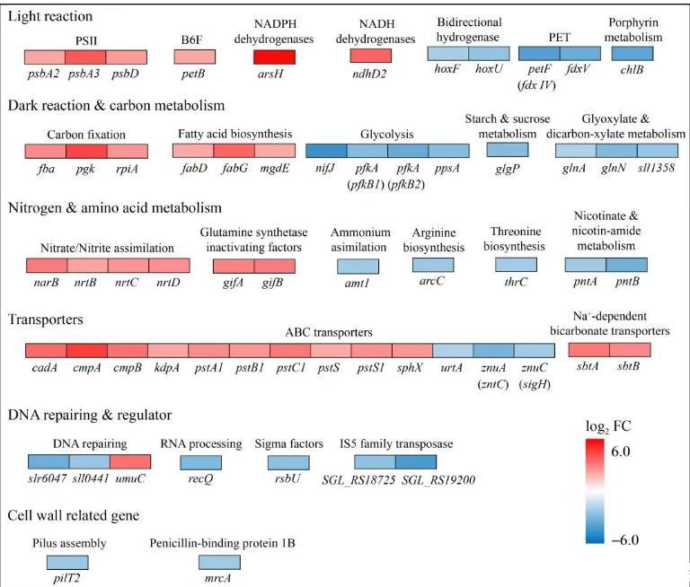 與以上光反應(yīng)相關(guān)基因的差異化表達(dá)趨勢類似,在高光條件下,相比野生型6803,高光6803中與光合固碳、能量-物質(zhì)代謝、跨膜轉(zhuǎn)運(yùn)相關(guān)基因的表達(dá)水平也有顯著變化。如cmpA、cmpB編碼ATP依賴的碳酸氫鹽轉(zhuǎn)運(yùn)蛋白復(fù)合物組分,cmpA與cmpB的表達(dá)分別上調(diào)了24.3倍與10.5倍。此外,編碼卡爾文循環(huán)中核糖5-磷酸異構(gòu)酶的rpiA表達(dá)上調(diào)了6.0倍,編碼磷酸甘油酸激酶的pgk、編碼果糖-1,6-二磷酸醛縮酶的fba表達(dá)分別上調(diào)21.5倍與7.0倍。因此,我們推測高光6803耐高光、生長快、生物量積累多也得益于碳酸氫鹽轉(zhuǎn)運(yùn)蛋白復(fù)合物、固碳反應(yīng)相關(guān)基因的表達(dá)上調(diào)。
