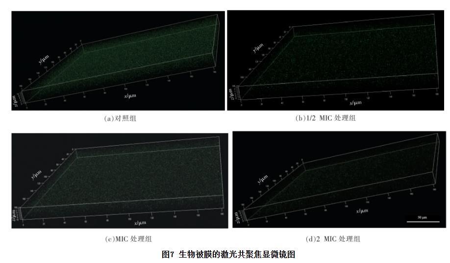觀察生物被膜的結(jié)構(gòu)對于了解苯乳酸的抑制生物被膜作用至關(guān)重要。用熒光染料對形成生物被膜的活細(xì)胞進(jìn)行染色,通過CLSM 觀察生物被膜熒光變化。圖7 是對照組與苯乳酸處理組霍氏腸桿菌生物被膜的激光共聚焦顯微立體圖像。對照組的生物被膜較厚,活菌數(shù)多,細(xì)菌較為密集,表明霍氏腸桿菌具有較強的生物被膜形成能力。隨著苯乳酸質(zhì)量濃度的增加,細(xì)胞的生物膜逐漸變薄,活菌數(shù)減少,細(xì)菌變得更加分散。結(jié)合苯乳酸對霍氏腸桿菌運動能力及生物被膜生成量的影響結(jié)果,表明苯乳酸可有效抑制了霍氏腸桿菌生物被膜的形成。