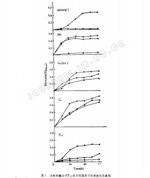 1.在不同溫度條件下親株和融合子的生長曲線:出發(fā)親株、直接親株和融合子在YPD液體培養(yǎng)中靜止培養(yǎng)在28℃、42℃和45℃,72h的生長曲線(圖1)表明營養(yǎng)缺陷型菌株的耐熱性比出發(fā)菌株顯著下降,而回到原養(yǎng)型的融合子耐熱性雖然各株不一,但也都比原出發(fā)親株略差。