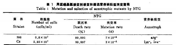 用250μg/mlNTG誘變1h,150μg/ml NY濃縮后檢出精氨酸缺陷型菌株396(arg-)、賴氨酸缺陷型菌株和亮氨酸缺陷型菌株Cσ(lcu-)(表1)。