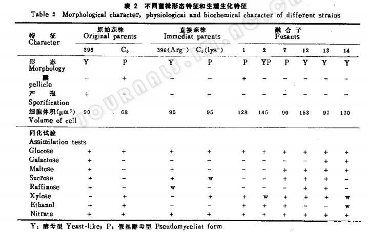 隨機(jī)挑出6株融合子進(jìn)行考核。從其從表2和表3可以看出融合子的培養(yǎng)特征形態(tài),大小、每個細(xì)胞的DNA含量和生理生化特征表現(xiàn)不一,特別是糖類同化更是多樣,其細(xì)胞體積平均為親株的1.3倍,DNA含量平均為親株的1.6倍。