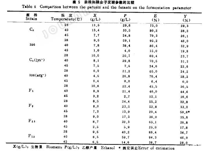 2.不同溫度條件下基質(zhì)消耗和乙醇產(chǎn)量的比較:各類型菌株在28℃、40℃和45℃培養(yǎng)條件下,利用甘蔗糖蜜發(fā)酵乙醇的各種參數(shù)(表5)表明,營養(yǎng)缺陷型菌株396(arg-)在不同溫度下,乙醇的產(chǎn)率和基質(zhì)的利用都比原出發(fā)親株:396低,經(jīng)過與耐熱菌株C。(1s-)融合后得到的融合子,只有F13一株乙醇產(chǎn)率和基質(zhì)利用率比較理想。在40℃和45℃下培養(yǎng),乙醇產(chǎn)量均高于原生產(chǎn)菌株396。
