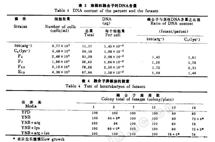 396(arg-)和Cσ(lS-)沒有檢出回復(fù)突變株,而C_8left(right.leuleft.^{-}right)的回復(fù)突變率為10^{-4}。從細(xì)胞形態(tài)上觀察396(arg-)和C_8left(1~s^{-}right)都與原出發(fā)菌株相似,而C_6(leu-)不論在YPD固體培養(yǎng)基上或液體培養(yǎng)基中均呈簇生的假菌絲型,不宜用于融合。