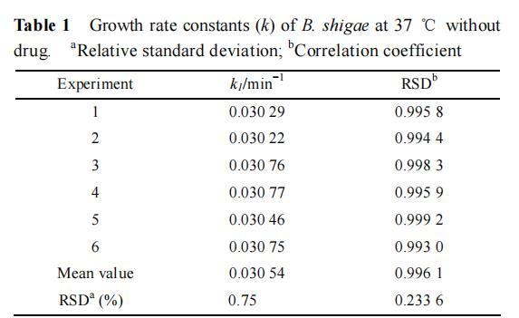 表 1 37℃ 下無(wú)藥時(shí)志賀痢疾桿菌的生長(zhǎng)速率常數(shù) (k)