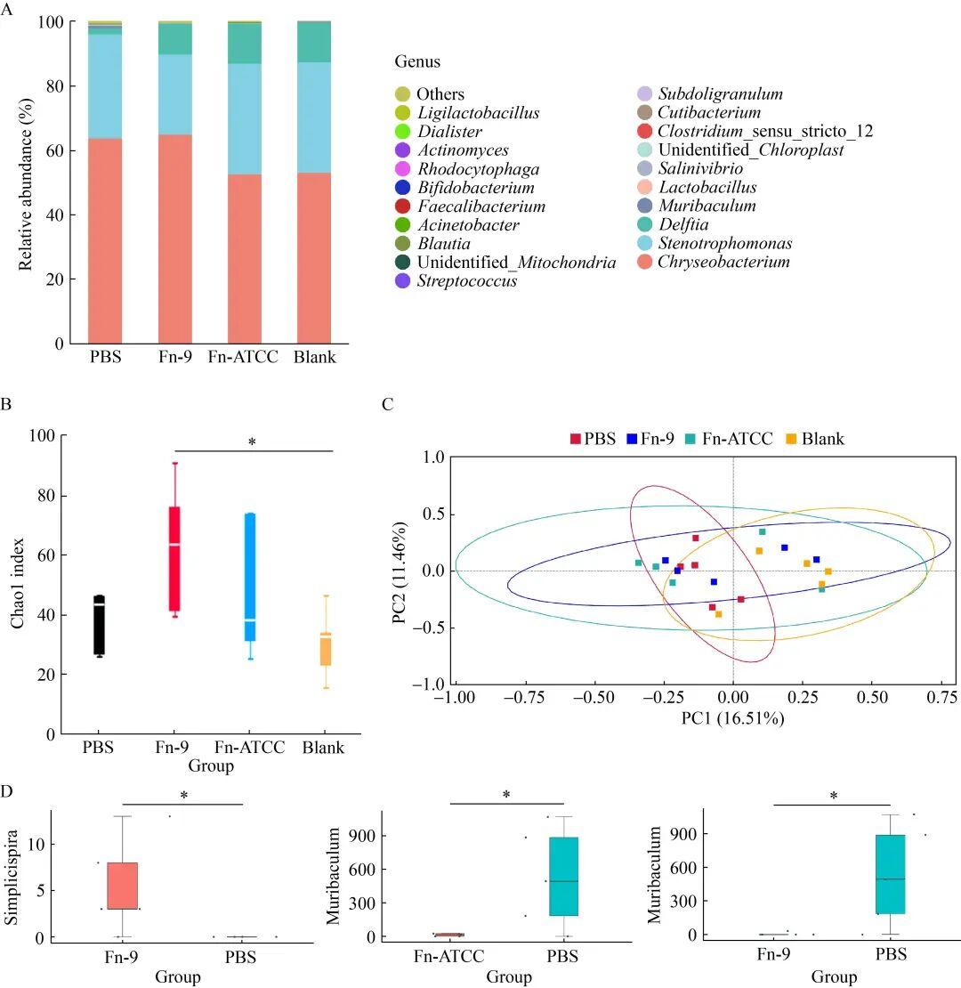 收集上述各組及正常小鼠的肺泡灌洗液,探討具核梭桿菌對肺微生物群的影響。在屬水平,F(xiàn)n-9組和Fn-ATCC組細(xì)菌組成明顯不同于PBS組(圖4A)。Chao1指數(shù)表明,F(xiàn)n-9組的α多樣性顯著高于空白組(圖4B)。然而,4組間的β多樣性無顯著差異(圖4C)。MetagenomeSeq分析顯示,F(xiàn)n-9組和Fn-ATCC組中Muribaculum的豐度顯著低于PBS組,而Fn-9組中Simplicispira的豐度顯著高于PBS組(圖4D)。