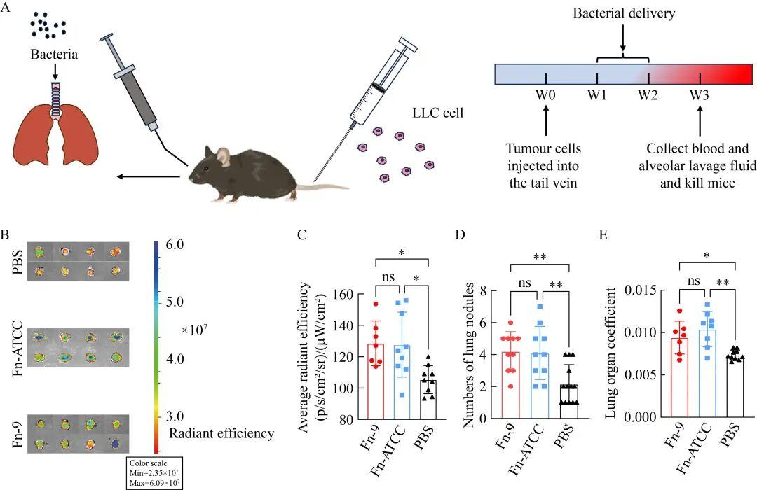 圖2具核梭桿菌促進(jìn)小鼠肺癌轉(zhuǎn)移。A:實(shí)驗(yàn)流程圖;B、C:Fn-9、Fn-ATCC和PBS 3組熒光強(qiáng)度比較;D、E:3組肺結(jié)節(jié)數(shù)量和肺器官系數(shù)。