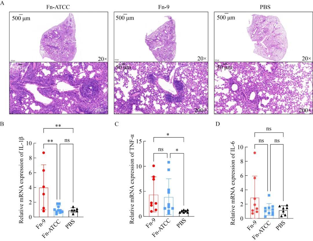 圖3病理切片圖和定量聚合酶鏈反應(yīng)(qPCR)。A:Fn-9、Fn-ATCC和PBS 3組肺組織切片;B-D:IL-1β、TNF-α和IL-6在小鼠肺組織中的表達(dá)(ns:無統(tǒng)計(jì)學(xué)意義;*: