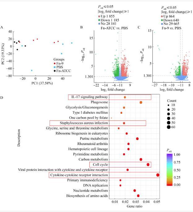 轉(zhuǎn)錄組測序用于描述肺組織變化的特征。主成分分析(principal components analysis,PCA)結(jié)果顯示,F(xiàn)n-9組、Fn-ATCC組和PBS組的轉(zhuǎn)錄組基因存在顯著差異(圖5A)。進(jìn)一步通過火山圖比較其差異基因的變化,發(fā)現(xiàn)與PBS組相比,F(xiàn)n-ATCC組共有1 855個差異基因表達(dá)上調(diào),1 185個差異基因表達(dá)下調(diào)(圖5B);而在Fn-9組與PBS組的比較中,F(xiàn)n-9組共有864個差異基因表達(dá)上調(diào),640個差異基因表達(dá)下調(diào)(圖5C)。隨后,分析了3組小鼠肺組織中KEGG通路差異基因的富集情況。在Fn-9組、Fn-ATCC組和PBS組的比較中,差異基因主要富集在IL-17信號通路、細(xì)胞因子-細(xì)胞因子受體相互作用、細(xì)胞周期和運(yùn)動蛋白等信號通路上,這提示Fn-9組和Fn-ATCC組2種菌株可能通過調(diào)節(jié)免疫反應(yīng)來促進(jìn)肺癌的進(jìn)展(圖5D、5E)。
