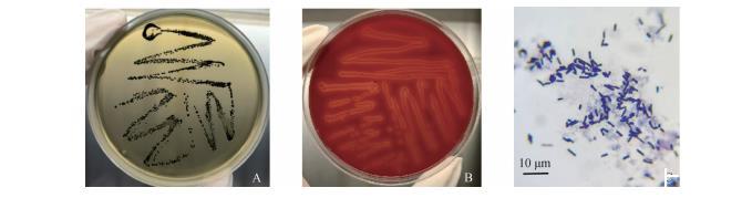 2.2.1 細(xì)菌分離鑒定分離菌株在RCM液體培養(yǎng)基中生長時(shí)出現(xiàn)渾濁并產(chǎn)生氣泡;在胰胨-亞硫酸鹽-環(huán)絲氨酸瓊脂(TSC)培養(yǎng)基上形成直徑2~5mm的外圍含有一圈白色暈圈的圓形黑色菌落(圖1A);在7%羊血瓊脂培養(yǎng)基上可形成表面光滑、顏色灰白、透明狀的圓形菌落(圖1B);鏡檢為革蘭陽性短桿菌(圖1C)。