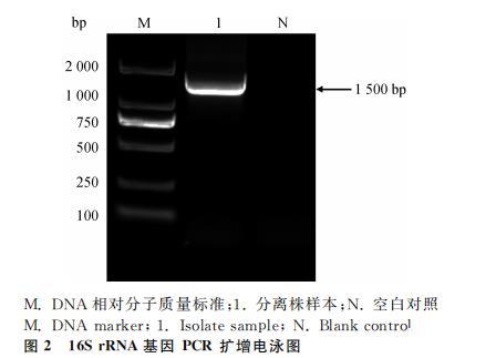 2.2.2 16S rRNA檢測(cè)16S rRNA基因PCR擴(kuò)增產(chǎn)物大小約為1500bp(圖2),與預(yù)期長度一樣。