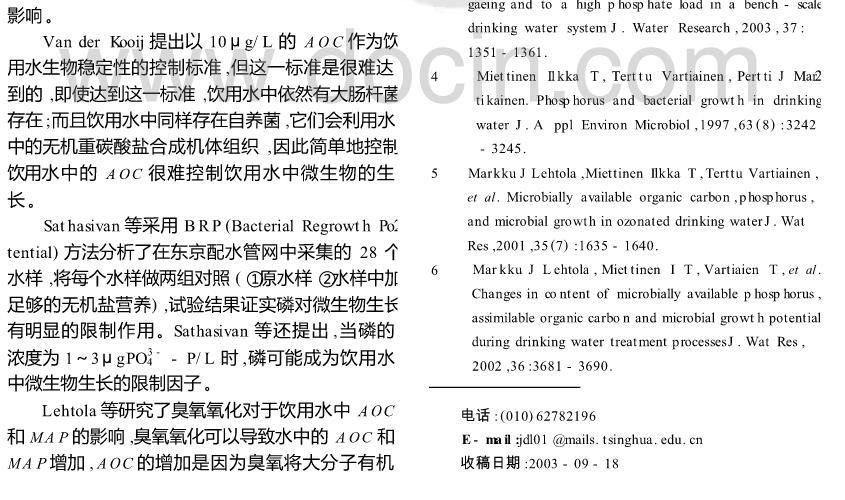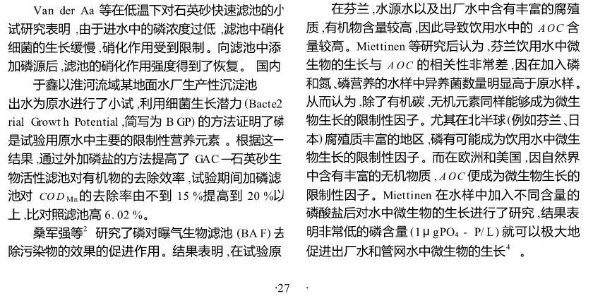 【摘要】:闡述了磷在微生物生長中的重要作用以及磷限制微生物生長的作用機理,介紹了飲用水中可以被微生物利用的磷源。著重從三個方面討論了磷對微生物生長限制作用的最新研究進展:外加磷源提高水處理構(gòu)筑物的處理效率;磷對管網(wǎng)生物膜的影響;磷對飲用水生物穩(wěn)定性的影響。